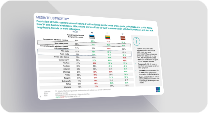 MEDIATRUSTWORTHY Population of Baltic countries more likely to trust traditional media (news online portal, print media and public media) than V4 and Austria inhabitants. Lithuanians are less likely to trust to conversation with family members and also with neighbours, friends or work colleagues. V4 + AT EE LT LV Poland, Czechia, Slovakia, Hungary (V4) + Austria Conversations with family members 80% 85% 74 % 83 % Newsonlineportals 65% 78% 70 % 69 % Conversations with neighbours, friends 67% 69% 55 % 66 % ✓ In general, people with lower andworkcolleagues educationare less likely to trust Print media 61% 76% 68 % 62 % public media, print media, Public media 56% 71% 66 % 62 % commercial TV, News online portals, private radio stations. On the other Private radio stations 58% 60% 62 % 49 % hand, they more often trust social CommercialTV 56% 61% 60 % 45 % mediasuch as Facebook, Instagram, TikTok, Telegram, VKontakte. YouTube 47% 43% 52 % 55 % ✓ Young people (18 – 34 years) are Facebook 38% 38% 49 % 48 % more likely to trust social media than Instagram 32% 30% 34 % 36 % other age groups. WhatsApp 31% 22% 26 % 51 % ✓ The oldest group of population (55 – 65 years) prefers more frequent Twitter 30% 26% 29 % 34 % conversation with family members. Telegram 24% 24% 31 % 36 % ✓ Public, printed media and news on Chain emails 15% 11% 24 % 21 % online portals are considered more TikTok 20% 16% 26 % 26 % trustworthy by university educated people. VKontakte 16% 13% 17 % 15 % Question: Q3.Whichofthefollowing sources of information and media do you consider authoritative? Base: n=1000 per country Note: T2B displayed: (Very trustworthy + Rather trustworthy). 4 Higher/Lower than average of V4 + AT