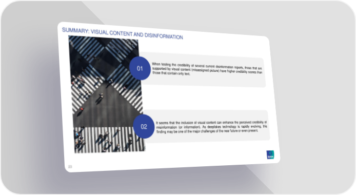 SUMMARY: VISUAL CONTENT AND DISINFORMATION When testing the credibility of several current disinformation reports, those that are 01 supported by visual content (misassigned picture) have higher credibility scores than those that contain only text. It seems that the inclusion of visual content can enhance the perceived credibility of 02 misinformation (or information). As deepfakes technology is rapidly evolving, this finding may be one of the major challenges of the near future or even present. 23