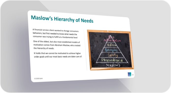 Maslow’s Hierarchy of Needs A financial service client wanted to change consumers behaviors, but first needed to know what needs the consumer was trying to fulfill at a fundamental level One of the oldest, but also most established models of motivation comes from Abraham Maslow, who created the hierarchy of needs. It holds that we cannot be motivated to achieve higher order goals until our most basic needs are taken care of. 24 © 2018 Ipsos 24