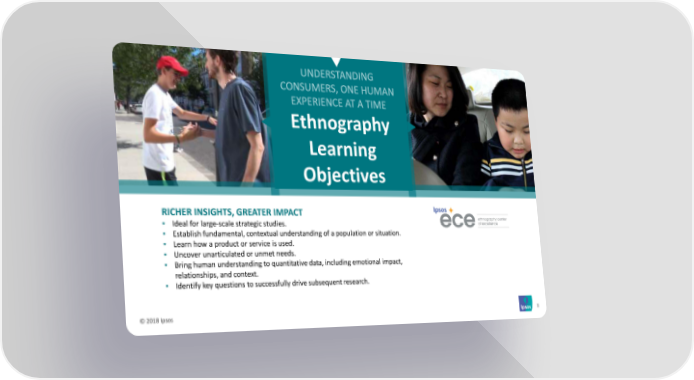 Ethnography Learning Objectives RICHER INSIGHTS, GREATER IMPACT • Ideal for large-scale strategic studies. • Establish fundamental, contextual understanding of a population or situation. • Learn how a product or service is used. • Uncover unarticulated or unmet needs. • Bring human understanding to quantitative data, including emotional impact, relationships, and context. • Identify key questions to successfully drive subsequent research. © 2018 Ipsos 8