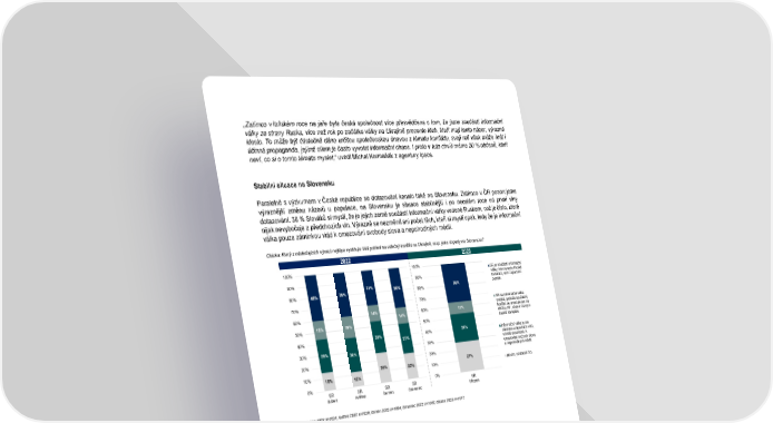 „Zatímco v loňském roce na jaře byla česká společnost více přesvědčena o tom, že jsme součástí informační války ze strany Ruska, více než rok po začátku války na Ukrajině procento těch, kteří mají tento názor, výrazně kleslo. To může být částečně dáno určitou společenskou únavou z tématu konfliktu, svoji roli však může hrát i účinná propaganda, jejímž cílem je často vyvolat informační chaos. I proto v tuto chvíli máme 30 % občanů, kteří neví, co si o tomto tématu myslet,“ uvedl Michal Kormaňák z agentury Ipsos. Stabilní situace na Slovensku Paralelně s výzkumem v České republice se dotazování konalo také na Slovensku. Zatímco v ČR pozorujeme výraznější změnu názorů u populace, na Slovensku je situace stabilnější i po necelém roce od první vlny dotazování. 36 % Slováků si myslí, že je jejich země součástí informační války vedené Ruskem, což je číslo, které nijak nevybočuje z předchozích vln. Výrazně se nezměnil ani počet těch, kteří si myslí opak, tedy že je informační válka pouze záminkou vlád k omezování svobody slova a nepohodlných médií. Otázka: Který z následujících výroků nejlépe vystihuje Váš pohled na válečný konflikt na Ukrajině, resp. jeho dopady na Slovensko? Báze: duben 2022 n=1024; květen 2022 n=1029; červen 2022 n=1004; červenec 2022 n=1042; březen 2023 n=1017 TISKOVÁ ZPRÁVA | IPSOS